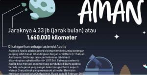 MERDEKABICARA.COM – Lembaga Penerbangan dan Antariksa Nasional (LAPAN) dalam berita terbarunya yang juga mengutip beberapa sumber mengatakan bahwa, berdasarkan data yang diperoleh dari Center of Near Earth Object Studies (CNEOS) NASA (https://cneos.jpl.nasa.gov), Asteroid 2016 HP6 akan mendekati Bumi pada hari Kamis, 7 Mei 2020 pukul 21:48 Universal Time (Jumat, 8 Mei 2020 pukul 4.48 Waktu Indonesia Barat) pada jarak 4,33 jb (jarak bulan) atau 1,66 juta kilometer. Asteroid ini memiliki kecpatan relatif 5,72 kilometer per detik ketika mendekati Bumi dan dikategorikan sebagai asteroid Apollo.