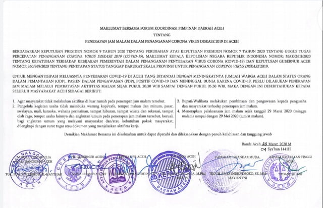“Pengelola kegiatan usaha tidak membuka warung kopi/cafe, tempat makan dan minum, pasar, swalayan, mall, karoke, tempat wisata, tempat olahraga, dan angkutan umum pada penerapan jam malam. Kecuali bagi angkutan umum yang melayani kebutuhan pokok masyarakat, dilengkapi dengan surat tugas atau dokumen yang menjelaskan aktivitas kerja,” demikian poin kedua dalam maklumat bersama Forkopimda Aceh itu.