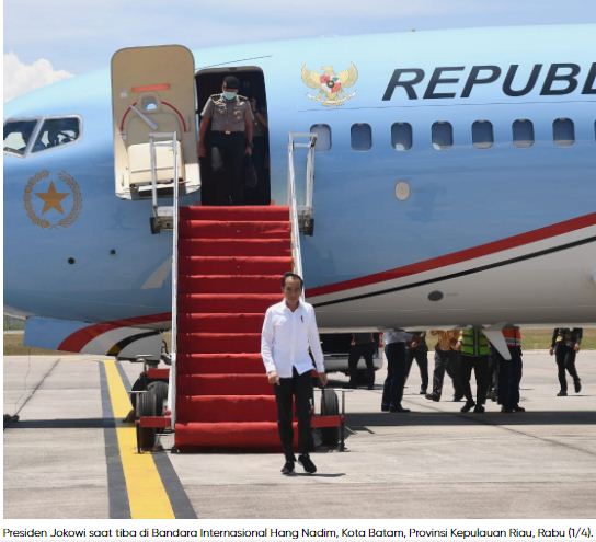 Kepala Negara dan rombongan terbatas lepas landas dari Pangkalan TNI AU Halim Perdanakusuma, Jakarta, sekira pukul 10.00 WIB untuk menuju Bandar Udara (Bandara) Internasional Hang Nadim, Kota Batam, Provinsi Kepulauan Riau.