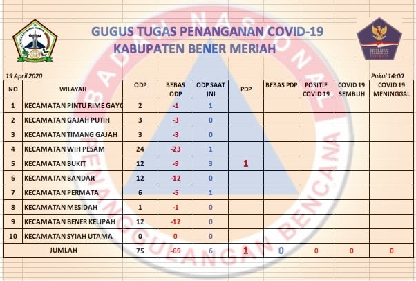 Update laporan harian Covid-19 di Bener Meriah tanggal 19 April 2020 tepat pukuk 12.00 wib, Total ODP kemarin 7 orang, belum ada bertambah tetapi berkurang 1 orang dari Kecamatan Bandar, maka berumlah ODP 6 orang.