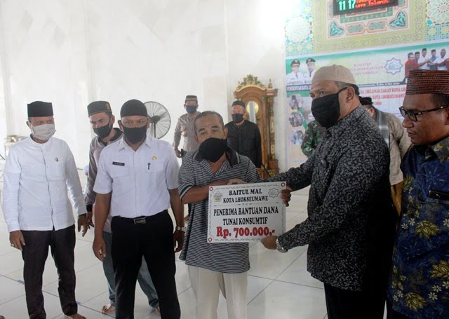 MERDEKABICARA.COM | LHOKSEUMAWE – Baitul Mal Kota Lhokseumawe menyalurkan dana zakat kepada 2.973 Mustahiq (penerima) fakir miskin yang berada di empat Kecamatan. Pemberian bantuan tersebut dilakukan secara simbolis di Islamic Center Lhokseumawe, Rabu 6/5/2020.