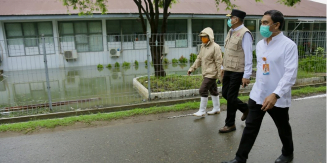MERDEKABICARA.COM | BANDA ACEH – Pelaksana Tugas Gubernur Aceh, Nova Iriansyah, meninjau kondisi area ruang isolasi pinere yang tergenang air akibat hujan deras yang melanda kawasan Banda Aceh, di komplek Rumah Sakit Umum Zainoel Abidin (RSUZA) lama, Jum’at, (8/5/2020).