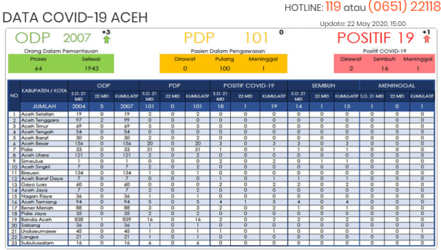 Sementara itu, SAG menyampaikan kondisi terakhir percepatan penanganan Covid-19 oleh Gugus Tugas Pemerintah Aceh dan kabupaten/kota per tanggal 22 Mei 2020, pukul 15.00 WIB. Jumlah Orang Dalam Pemantauan (ODP) di Aceh sebanyak 2.007 kasus/orang. Ada penambahan 3 kasus  dibandingkan dengan kemarin.