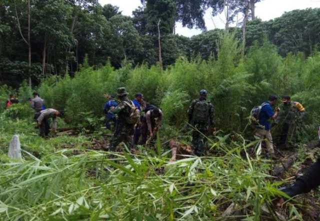 Pemusnahan dilakukan oleh puluhan Personil Polisi dan TNI dengan cara dicabut kemudian langsung dibakar dilokasi, Senin lalu (20/07).