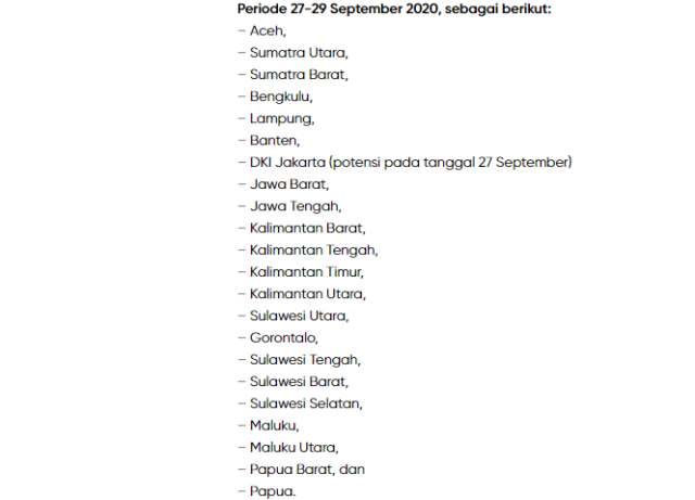 “Hal ini memberikan kontribusi pada peningkatan massa udara basah yang mendukung terbentuknya awan-awan hujan dalam beberapa hari ke depan,” ujar Deputi Bidang Meteorologi Badan Meteorologi, Klimatologi, dan Geofisika (BMKG), Guswanto melalui rilis, Minggu (27/9).