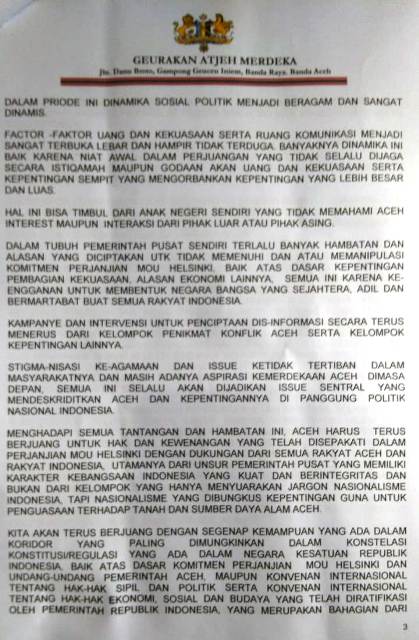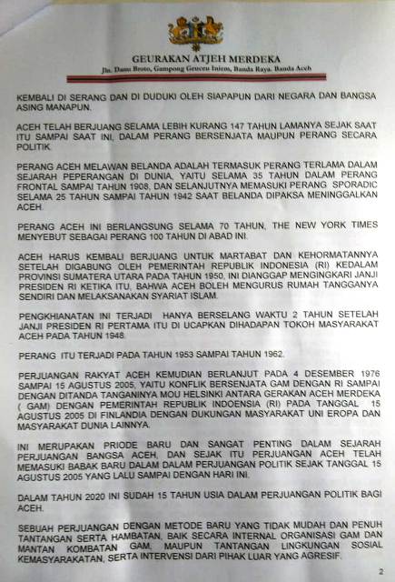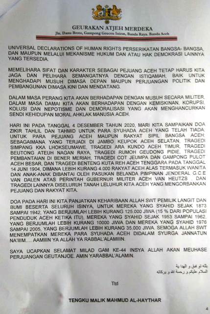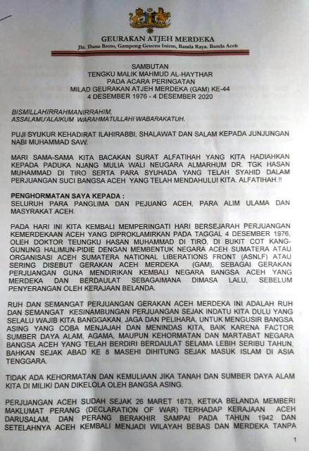 Berikut Sambutan Wali Nanggroe yang dibacakan oleh Ketua KPA Wilayah Kuta Pase, Mukhtar Hanafiah, pada Milad GAM yang Ke 44 :