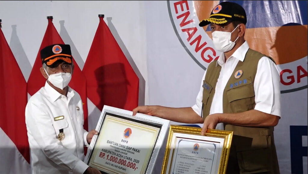 MERDEKABICARA- Badan Nasional Penanggulangan Bencana ( PNPB ) pusat menyerahkan bantuan uang tunai milyaran rupiah kepada sejumlah kabupaten Kota yang dilanda bencana air dan longsor . Selain uang, BNPB uga menyerahkan sejumlah alat kesehatan untuk penaggulangan virus covid-19.