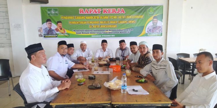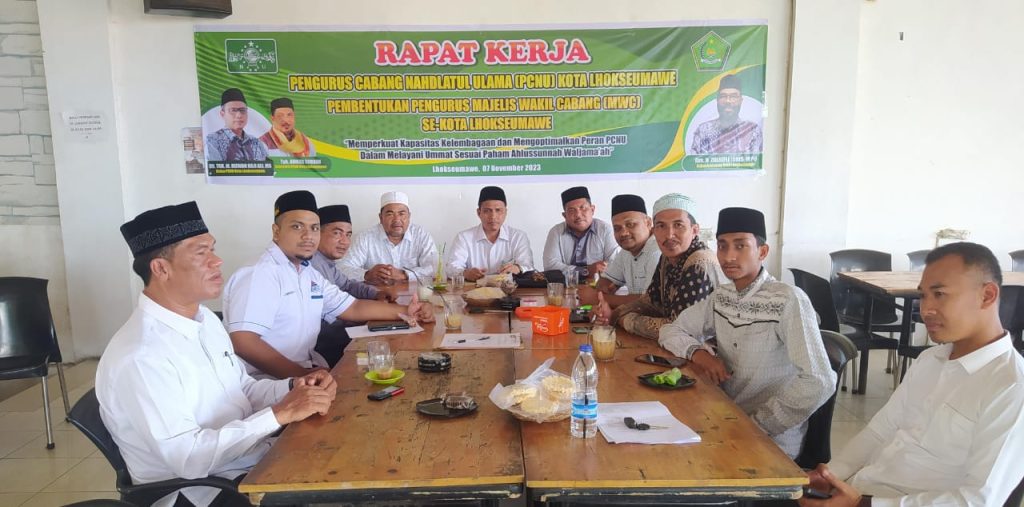 MERDEKABICARA.COM | LHOKSEUMAWE – Pengurus Cabang Nahdatul Ulama (PCNU) Lhokseumawe menggelar Rapat Kerja untuk menyempurnakan kepengurusan Majelis Wakil Cabang (MWC) tingkat kecamatan se-Kota Lhokseumawe. Kegiatan tersebut digelar di Coffee Time, Lhokseumawe, Selasa (7/11/2023).