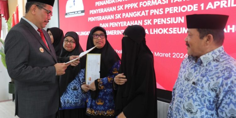 MERDEKABICARA.COM | LHOKSEUMAWE – Pemerintah Kota (Pemko) Lhokseumawe menggelar penyerahan Surat Keputusan (SK) dan penandatanganan perjanjian kerja 141 orang tenaga PPPK Formasi tahun 2023 yang berlangsung di aula kantor Walikota Lhokseumawe, Sabtu (23/03/2024).