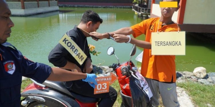 Reka ulang adegan yang seharusnya berlangsung di lokasi kejadian, yaitu di kawasan irigasi persawahan Gampong Raya Paleu Kecamatan Simpang Tiga, Kabupaten Pidie dialihkan ke lokasi parkir depan ruangan Satreskrim Polres Pidie.