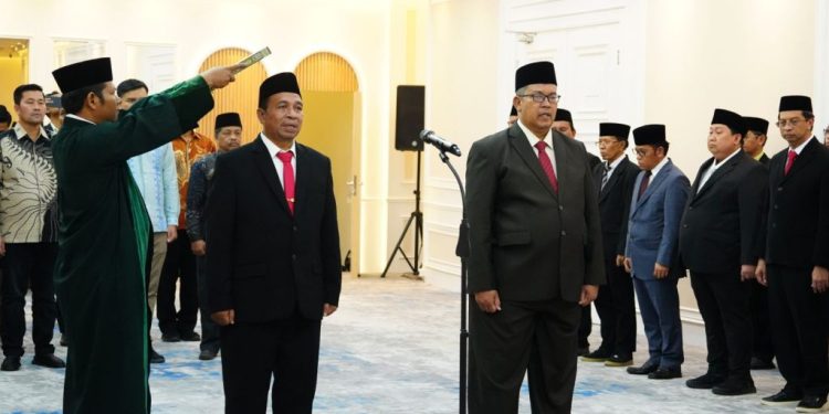 Tampil sebagai saksi pelantikan, Sekjen Kemenag Prof. Dr. H. Muhammad Ali Ramdhani, S.T.P., M.T, dan Staf Ahli Bidang Hukum dan Hak Asasi Manusia Kemenag juga sebagai Plt. Dirjen Pendidikan Islam Prof. Dr. H. Abu Rokhmad, M.Ag.
