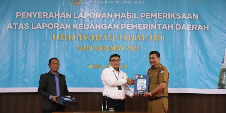 Penjabat (Pj) Wali Kota Lhokseumawe A Hanan didampingi Wakil Ketua DPRK T Sofianus menerima Laporan Hasil Pemeriksaan (LHP) berdasarkan LKPD Tahun Anggaran 2023 dari Kepala Kantor Badan Pemeriksa Keuangan (BPK) Perwakilan Aceh Rio Tirta yang diwakili oleh Kepala Sub Auditorat I Triana. Penyerahan tersebut bertempat di Auditorium Kantor BPK Perwakilan Aceh di Banda Aceh, Senin (20/5/2024).