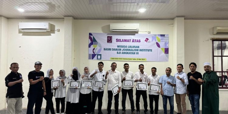 MERDEKABICARA.COM | LHOKSEUMAWE – Basri Daham Journalism Institute (BJI) Lhokseumawe, mewisudakan 16 siswa angkatan ke-VI di Lido Graha Hotel, kota setempat, Sabtu, 25 Mei 2024.