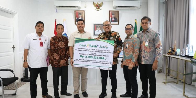 MERDEKABICARA.COM | LHOKSEUMAWE – PT Bank Aceh Syariah Lhokseumawe menyerahkan pembagian laba perusahaan atau dividen tahun buku 2023 senilai Rp2,7 miliar lebih kepada Pemerintah Kota (Pemko) Lhokseumawe.