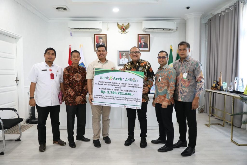 MERDEKABICARA.COM | LHOKSEUMAWE – PT Bank Aceh Syariah Lhokseumawe menyerahkan pembagian laba perusahaan atau dividen tahun buku 2023 senilai Rp2,7 miliar lebih kepada Pemerintah Kota (Pemko) Lhokseumawe.