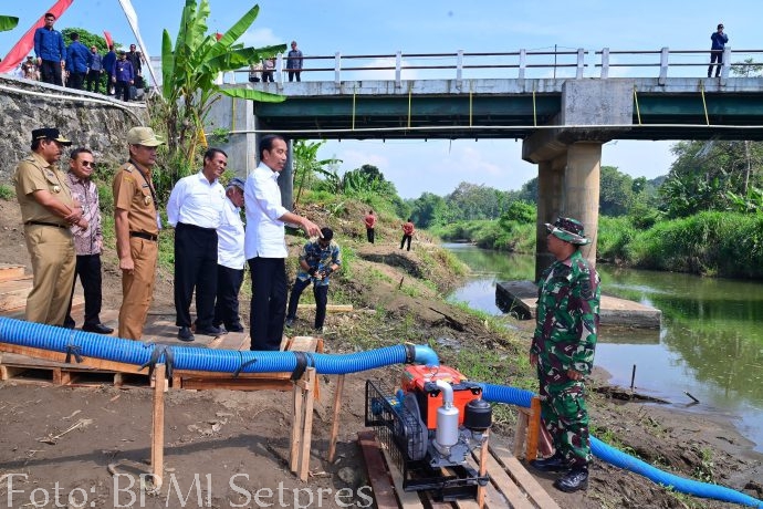 Presiden RI Joko Widodo (Jokowi) meninjau Program Bantuan Pompa Air di Desa Krendowahono, Kecamatan Gondang Rejo, Kabupaten Karanganyar, Jawa Tengah, Rabu (19/06/2024) pagi. Presiden menyampaikan bahwa program ini penting dalam menghadapi potensi kekeringan panjang yang diperkirakan akan terjadi pada bulan Juli hingga Oktober.
