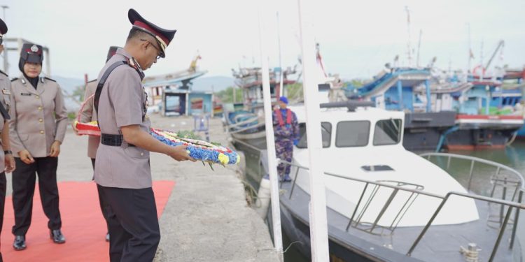 MERDEKABICARA.COM | PIDIE -Rangkaian kegiatan Hari Bhayangkara Ke-78 tahun 2024, Polres Pidie melaksanakan upacara Tabur Bunga di Dermaga Mako Satpolairud Polres Pidie yang berada di PPI Gampong Pasi Peukan Baro Kecamatan Kota Sigli, pelaksanaan upacara tabur bunga ini sebagai bentuk penghormatan kepada arwah para Pahlawan yang telah gugur. Senin (24/6/2024).