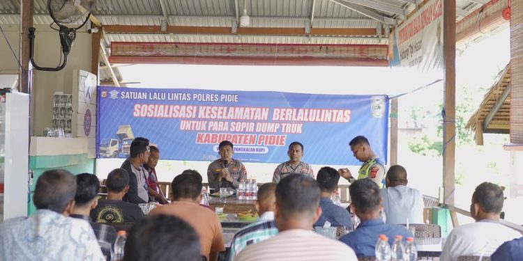 MERDEKABICARA.COM | PIDIE – Satuan Lalulintas Polres Pidie memberikan edukasi tentang tertib berlalu lintas kepada para pengemudi dump truk, sosialisasi tersebut sebagai upaya untuk menekan angka pelanggaran dan kecelakaan yang terjadi di jalan raya.