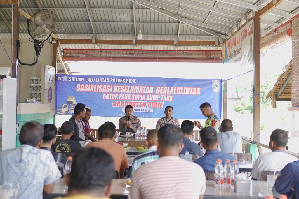 MERDEKABICARA.COM | PIDIE – Satuan Lalulintas Polres Pidie memberikan edukasi tentang tertib berlalu lintas kepada para pengemudi dump truk, sosialisasi tersebut sebagai upaya untuk menekan angka pelanggaran dan kecelakaan yang terjadi di jalan raya.