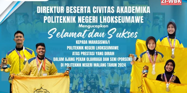 MERDEKABICARA.COM | LHOKSEUMAWE – Politeknik Negeri Malang (Polinema) selaKu tuan rumah sukses menggelar Pekan Olahraga dan Seni (PORSENI) XIV 2024 dengan diikuti oleh 58 kontingen politeknik dari seluruh Indonesia. Acara ini mempertandingkan berbagai cabang olahraga (cabor) dan cabang seni (casen) yang bertujuan untuk mempererat silaturahmi antar mahasiswa perguruan tinggi vokasi.