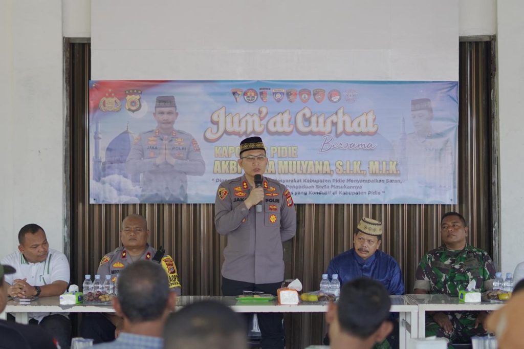 MERDEKABICARA.COM | PIDIE – Kapolres Pidie AKBP Jaka Mulyana, SIK, MIK bersama jajaran melaksanakan pertemuan dengan beberapa tokoh agama dan tokoh masyarakat, forum keuchik, Panitia Pemilihan Kecamatan (PPK), yang dilaksanakan di Warkop Zaki Kupi simpang aneuk mulieng Kecamatan Pidie, Jumat (2/8/2024).