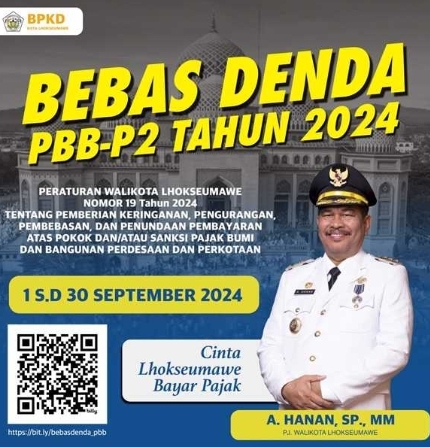 MERDEKABICARA.COM | LHOKSEUMAWE – Pemerintah Kota (Pemko) Lhokseumawe melalui Badan Pengelolaan Keuangan Daerah (BPKD) kembali meluncurkan program pembebasan sanksi administrasi dan denda keterlambatan pembayaran Pajak Bumi dan Bangunan Pedesaan dan Perkotaan (PBB-P2). Program yang dinamakan “Bebas Denda PBB-P2 Tahun 2024” ini akan berlaku mulai 1 hingga 30 September 2024.