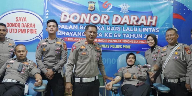 Sebanyak 35 personel Satlantas Polres Pidie ikut mendonorkan darahnya setelah melalui proses pengecekan kesehatan oleh petugas medis.