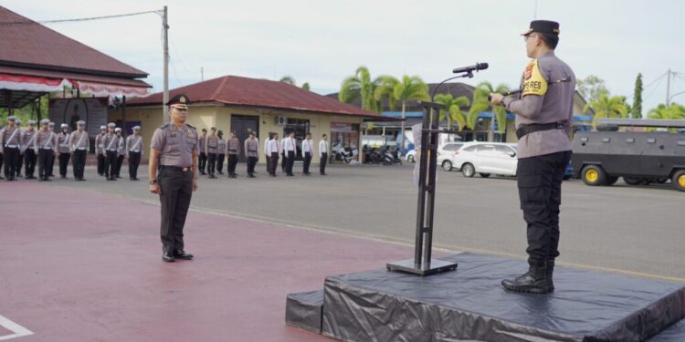 Kapolres Pidie AKBP Jaka Mulyana, SIK, MIK, bertindak selaku Irup saat Upacara Laporan Kenaikan Pangkat Pengabdian bagi Kompol Dody yang saat ini menjabat sebagai Kasubbagdalprogar Bagren Polres Pidie.