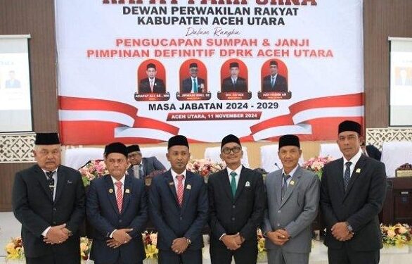 MERDEKABICARA.COM | ACEH UTARA -Empat Pimpinan definitif Dewan Perwakilan Rakyat Kabupaten Aceh Utara diambil sumpah yang berlangsung di Gedung DPRK Aceh Utara, Landing, Kecamatan Lhoksukon Senin 11 November 2024