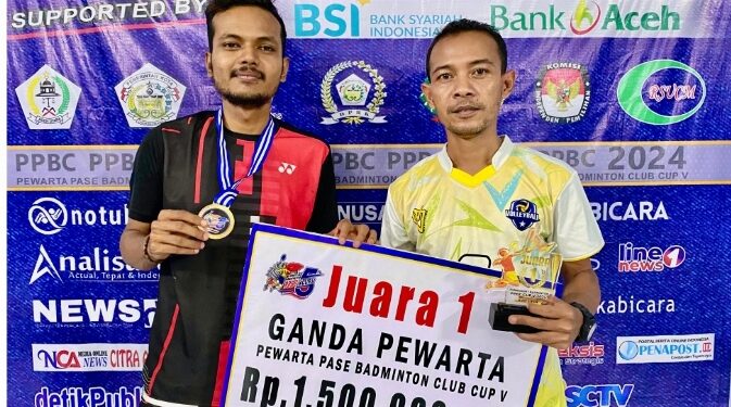 MERDEKABICARA.COM | LHOKSEUMAWE – Muzakir dan Ramadhan berhasil meraih juara pertama pada turnamen bulu tangkis kategori ganda tingkat wartawan yang diselenggarakan oleh Pewarta Pasee Badminton Club (PPBC) di gedung SKB Aceh Utara. Sedangkan juara kedua diraih oleh Jufri bersama Romo.