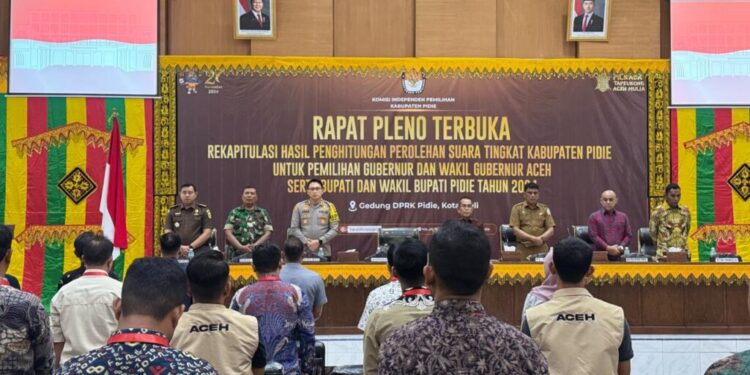 MERDEKABICARA.COM | PIDIE – Kapolres Pidie AKBP Jaka Mulyana, SIK, MIK menghadiri rapat pleno terbuka rekapitulasi hasil penghitungan perolehan suara tingkat kabupaten Pidie pada Pilkada tahun 2024, yang dilaksanakan oleh Komisi Independen Pemilihan (KIP) Kabupaten Pidie.