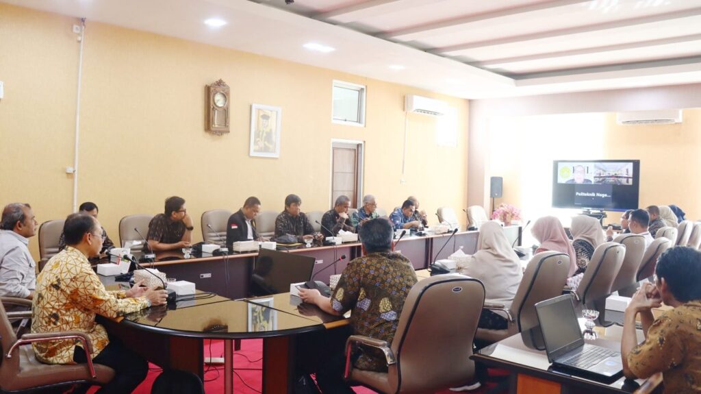 Direktur PNL, Ir. Rizal Syahyadi, ST. M.Eng.Sc. IPM. ASEAN.Eng. APEC.Eng, menyampaikan sambutannya secara virtual dari Coventry University, Inggris, tempat beliau tengah mengikuti program sertifikasi kompetensi manajemen dan kepemimpinan. Dalam sambutannya, Direktur mengungkapkan rasa syukur atas proses asesmen ini sebagai langkah penting dalam menjaga mutu pendidikan di PNL.