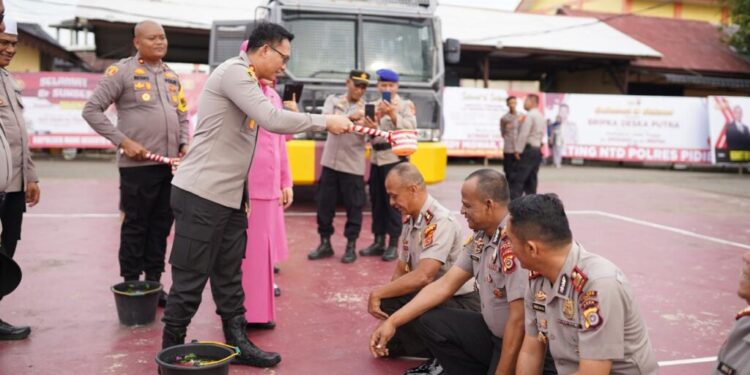 “Kemudian dilanjutkan dengan acara penyiraman air bunga kepada personel yang naik pangkat yang dilapangan Apel Polres Pidie” sebut AKP Anwar, S.Ag. {}