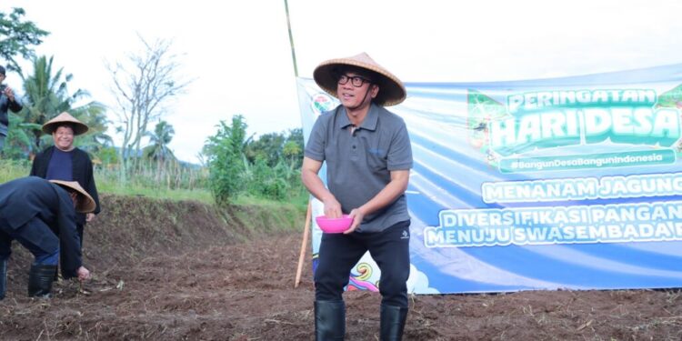 MERDEKABICARA.COM | SUBANG – Menteri Desa dan Pembangunan Daerah Tertinggal (Mendes PDT) Yandri Susanto bersama Wakil Mendes PDT Ahmad Riza Patria melakukan penanaman benih jagung di Desa Cisaat, Kecamatan Ciater, Kabupaten Subang, Rabu (15/1/2025).
