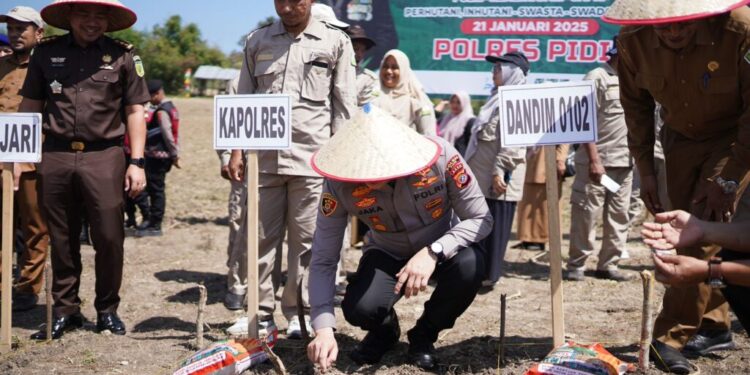 MEREDEKABICARA.COM | PIDIE – Polres Pidie bersama pemerintah Kabupaten Pidie melaksanakan penanaman jagung di area lahan perkebunan Gampong Cot Kecamatan Muara Tiga Kabupaten Pidie, Selasa (21/1/2025).