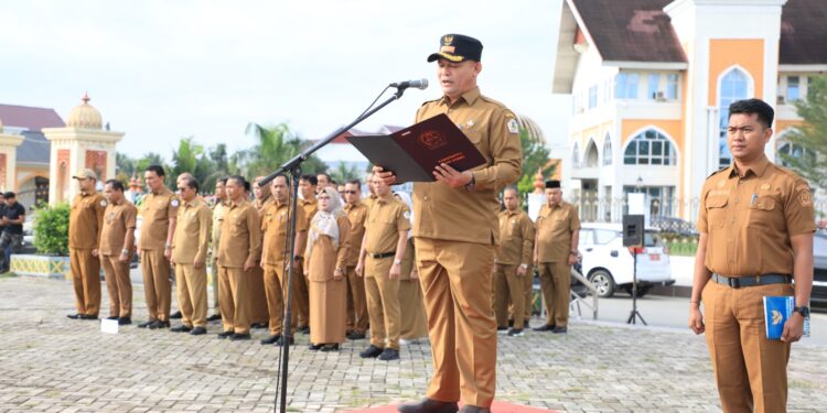 MERDEKABICARA.COM | ACEH UTARA -Bupati Aceh Utara H Ismail A Jalil, SE, MM, memimpin apel gabungan perdana ASN dan seluruh pejabat jajaran Pemkab Aceh Utara, Selasa, 18 Februari 2025. Dalam apel yang berlangsung di lapangan Landing depan Kantor Bupati, dia mengajak ASN dan pejabat untuk memperbaharui diri di bawah kepemimpinan Bupati – Wakil Bupati yang baru.