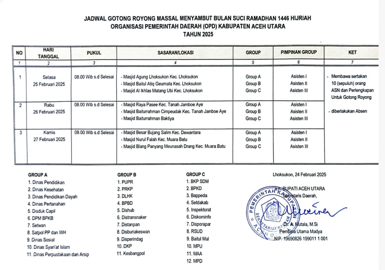 Berdasarkan jadwal gotong royong massal yang ditandatangani Sekda Aceh Utara, Dr. A. Murtala, M.Si, gotong royong itu berlangsung selama tiga hari, dimulai pukul 08.00 WIB hingga selesai. Setiap harinya, kegiatan ini akan dilaksanakan di tiga lokasi berbeda yang telah dibagi ke dalam tiga kelompok kerja (Group A, B, dan C). Masing-masing kelompok terdiri dari berbagai OPD, dengan pimpinan group yang telah ditunjuk.