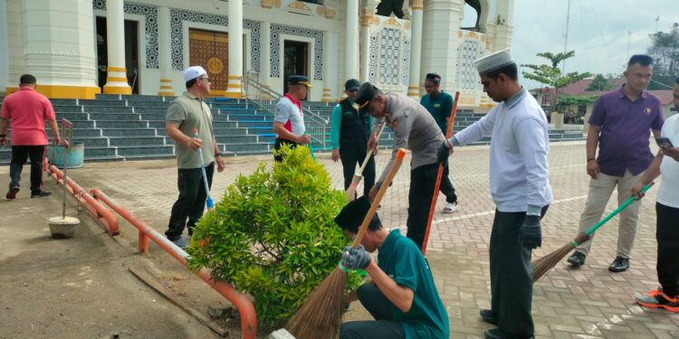 MERDEKABICARA.COM | ACEH UTARA -Masyarakat dan para pengurus Badan Kemakmuran Mesjid (BKM) ikut meramaikan kegiatan gotong royong massal dalam rangka bersih-bersih mesjid yang digelar oleh Pemerintah Kabupaten Aceh Utara pada hari kedua, Rabu, 26 Februari 2025.