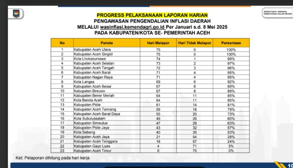 Capaian kinerja pelaporan harian pengendalian inflasi di Aceh menunjukkan bahwa selain Kabupaten Aceh Utara dan Kabupaten Aceh Singkil yang mencapai 100%, Kota Lhokseumawe berada di posisi selanjutnya dengan 99%, diikuti oleh Kabupaten Aceh Selatan (97%), Kabupaten Aceh Tengah (96%), serta Kabupaten Aceh Barat dan Kabupaten Nagan Raya yang sama-sama mencatatkan angka 95%. Kota Langsa mencatat 92%, Kabupaten Aceh Besar 89%, Kabupaten Bireuen 88%, dan Kabupaten Bener Meriah 85%.