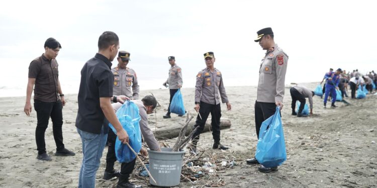 Kegiatan ini melibatkan personel Polres Pidie bersama masyarakat setempat yang turut berpartisipasi membersihkan area pantai dari sampah dan limbah.