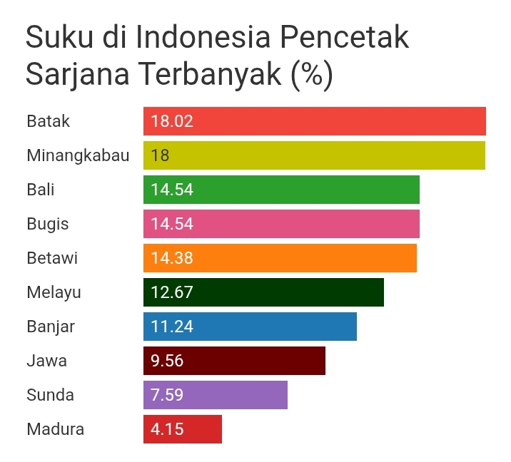 Berdasarkan data BPS, kontribusi sarjana dari suku Jawa hanya mencapai 9,56%, tertinggal jauh dibandingkan dua suku teratas.