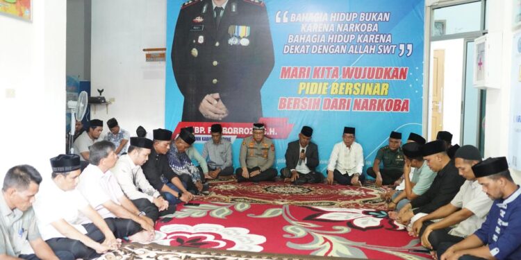 Dengan Kegiatan Dzikir dan doa bersama diharapkan menjadi simbol persatuan dan harapan agar masyarakat Pidie senantiasa dijauhkan dari bahaya laten narkotika, kata AKBP Fakrorrozi, SH. {}