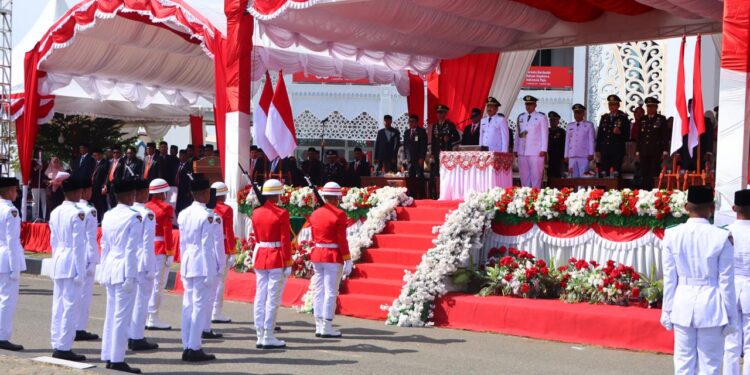 Suasana penuh khidmat terasa saat pengibaran bendera Merah Putih diiringi lagu kebangsaan Indonesia Raya, yang disaksikan langsung oleh unsur Forkopimda dan ribuan masyarakat.