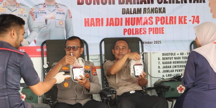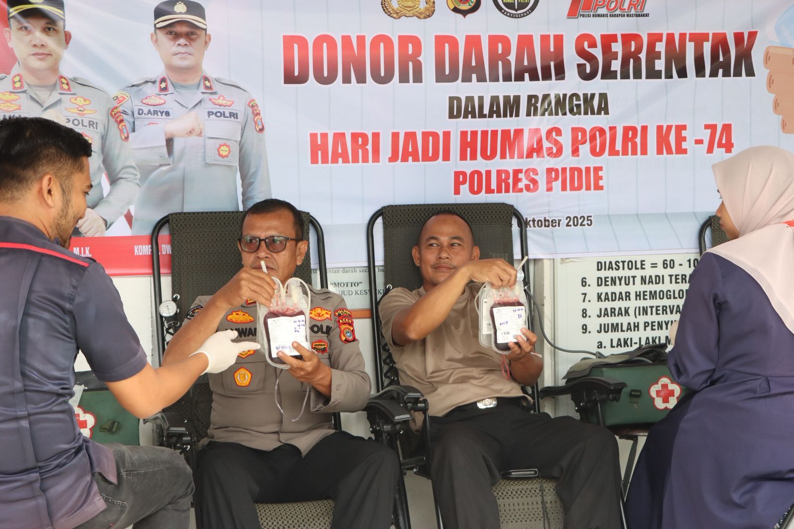 MERDEKABICARA.COM | PIDIE – Memperingati Hari Jadi Humas Polri ke-74 Tahun 2025, Polres Pidie melalui Seksi Humas bekerja sama dengan Seksi Dokkes dan Palang Merah Indonesia (PMI) Kabupaten Pidie menggelar kegiatan Bakti Kesehatan Donor Darah pada Rabu (22/10/2025).