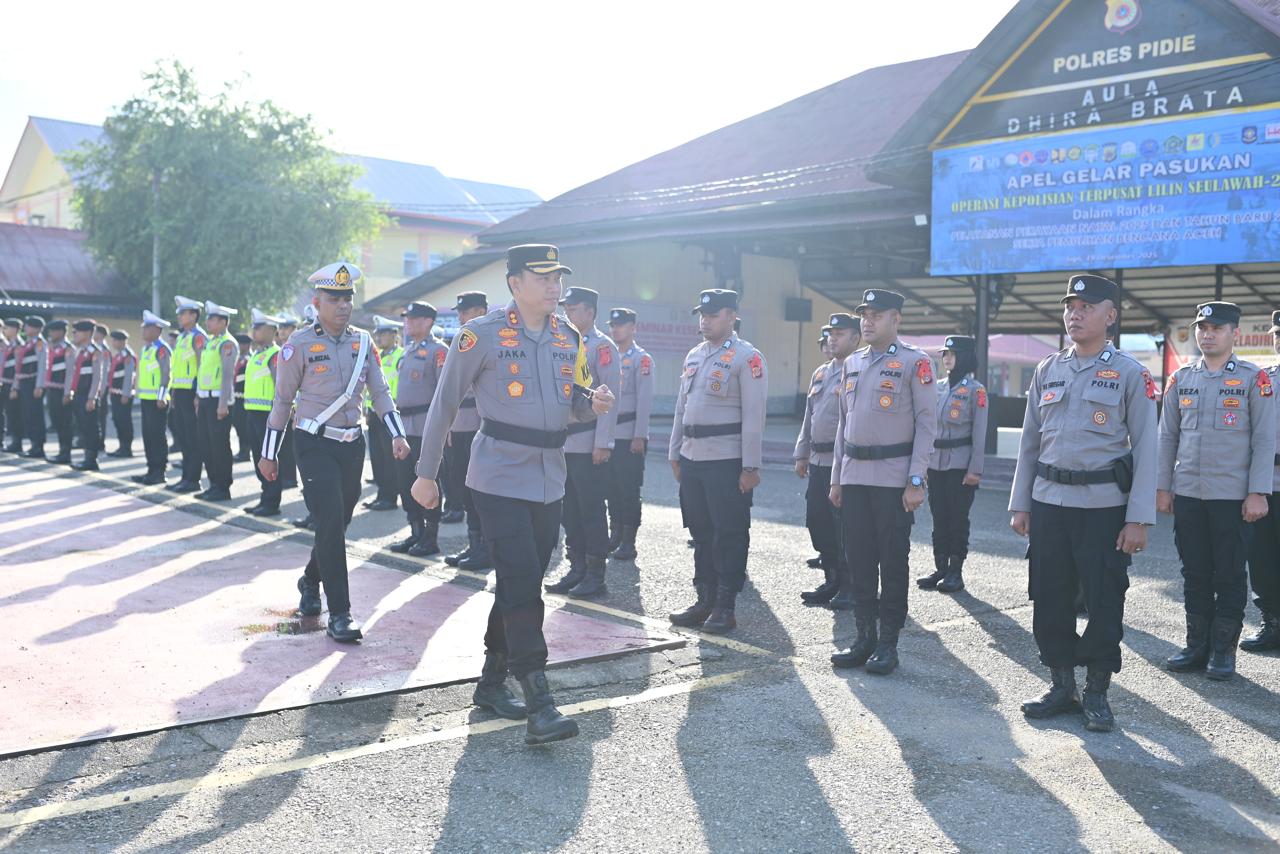MERDEKABICARA.COM | PIDIE – Polres Aceh Pidie menggelar Apel Gelar Pasukan Operasi Kepolisian Terpusat Lilin Seulawah Tahun 2025 yang dipimpin Langsung oleh Kapolres Pidie AKBP Jaka Mulyana, SIK, MIK, dalam rangka mewujudkan Sitkamtibmas dan Kamseltibcarlantas yang kondusif serta menjamin keamanan masyarakat dalam merayakan Natal tahun 2025 dan Tahun Baru 2026 Serta Pemulihan Bencana Aceh. Yang bertempat di lapangan Apel Polres Pidie. Jumat (19/12/2025)