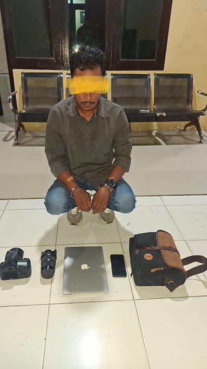 Dalam pengungkapan tersebut, petugas turut mengamankan sejumlah barang bukti berupa satu unit laptop MacBook Air warna silver, satu unit kamera Canon warna hitam, satu unit handphone Oppo warna abu-abu, serta satu buah tas.