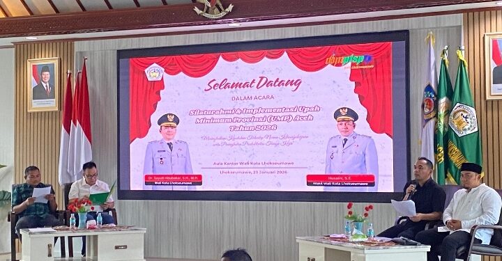 MERDEKABICARA.COM | LHOKSEUMAWE – Wali Kota Lhokseumawe Dr. Sayuti Abubakar, SH, MH memimpin langsung kegiatan Silaturahmi dan Implementasi Upah Minimum Provinsi (UMP) Aceh Tahun 2026 yang berlangsung di Aula Kantor Wali Kota Lhokseumawe pada Jum’at (23/01/2026) pagi. Kegiatan ini menjadi pertemuan perdana yang mempertemukan Pemerintah Kota Lhokseumawe dengan para pimpinan perusahaan dan pelaku usaha di wilayah setempat.