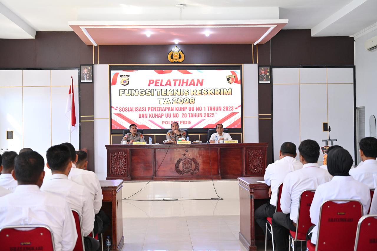 MERDEKABICARA.COM | PIDIE – Dalam rangka meningkatkan profesionalitas dan kompetensi personel, Polres Pidie melaksanakan Kegiatan Pelatihan Peningkatan Kemampuan (Latkatpuan) Fungsi Teknis Reserse Kriminal (Reskrim) Tahun Anggaran 2026, yang digelar pada Kamis, 29 Januari 2026, bertempat di Aula Wira Satya Polres Pidie.