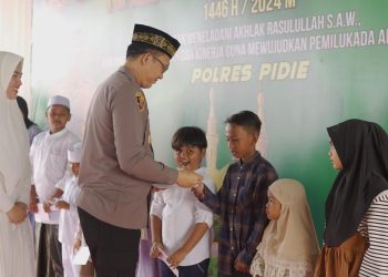 Kapolres Pidie Serahkan Sembako dan Santunan kepada Anak Yatim di Kecamatan Peukan Baro