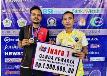 MERDEKABICARA.COM | LHOKSEUMAWE - Muzakir dan Ramadhan berhasil meraih juara pertama pada turnamen bulu tangkis kategori ganda tingkat wartawan yang ...